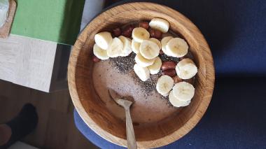 Potom si můžete do kaše přidat různé ingredience podle chuti – med, kakao, banán, jahody, borůvky (jakékoli ovoce v podstatě), mandle, lískové oříšky, kešu, lněné smínko, sezamové semínko, marmeládu, sirup,… Téměř cokoli 🙂